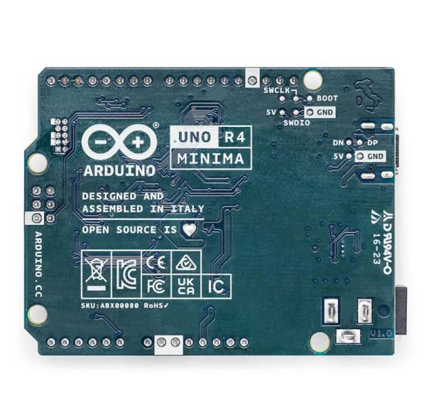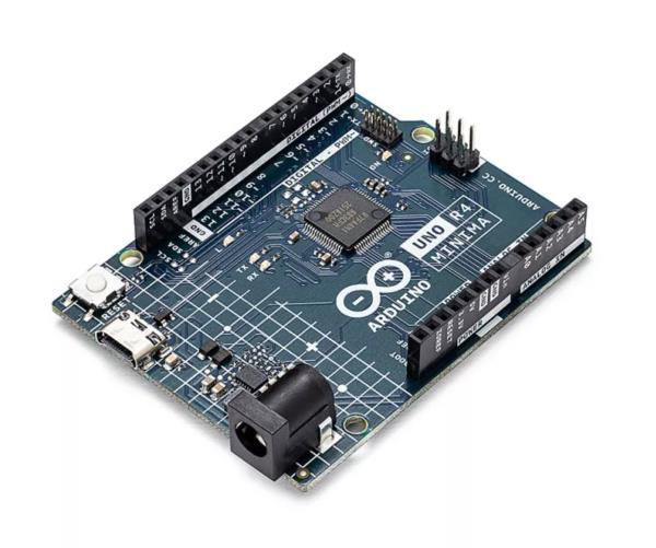 El UNO R4 Minima cuenta con un microcontrolador basado en el Renesas RA4M1 (Arm® Cortex-M4®) con una tensión de funcionamiento de 5 V. Tiene 14 E/S digitales, 6 entradas analógicas con una resolución de hasta 14 bits, una velocidad de reloj de 48 MHz y 32 kB de SRAM, 256 kB de memoria flash y 8 kB de EEPROM.