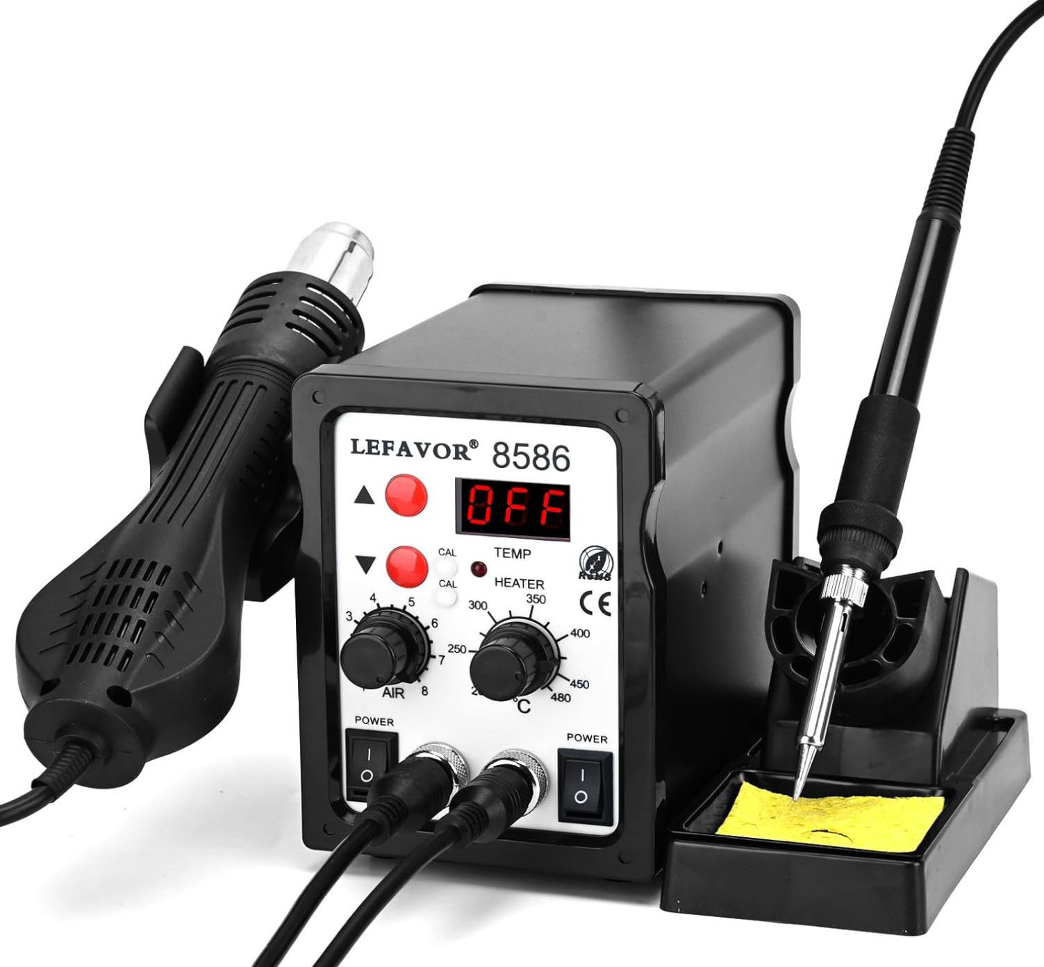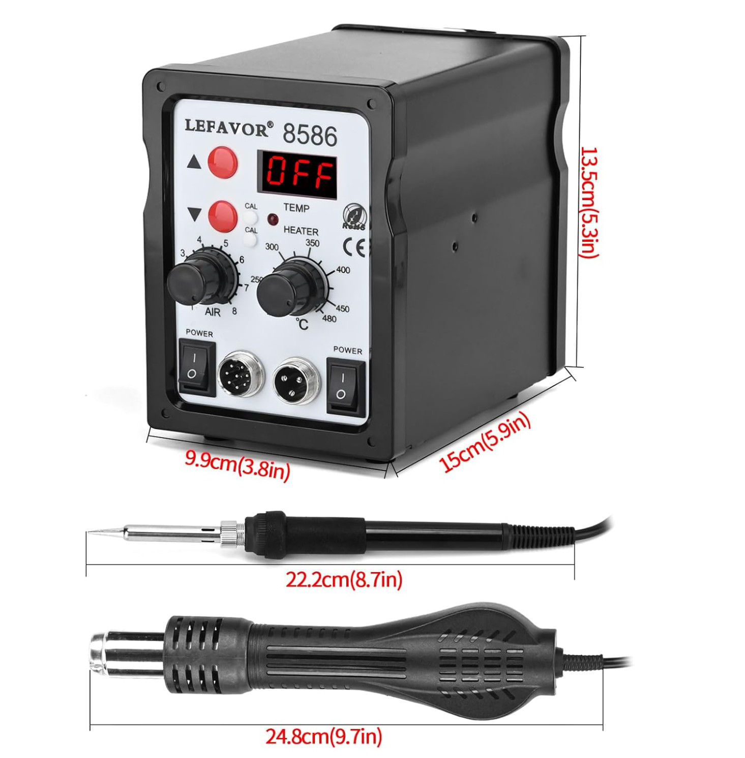 La estación de soldadura Youyue 8586 incluye un soldador de punta de tipo lápiz con templeratura regulable de 200 a 480ºC. También incluye pistola de aire caliente para soldadura smd. El flujo de aire y su temperatura son ajustables entre 0 y 120l/min y 100 y 450ºC.