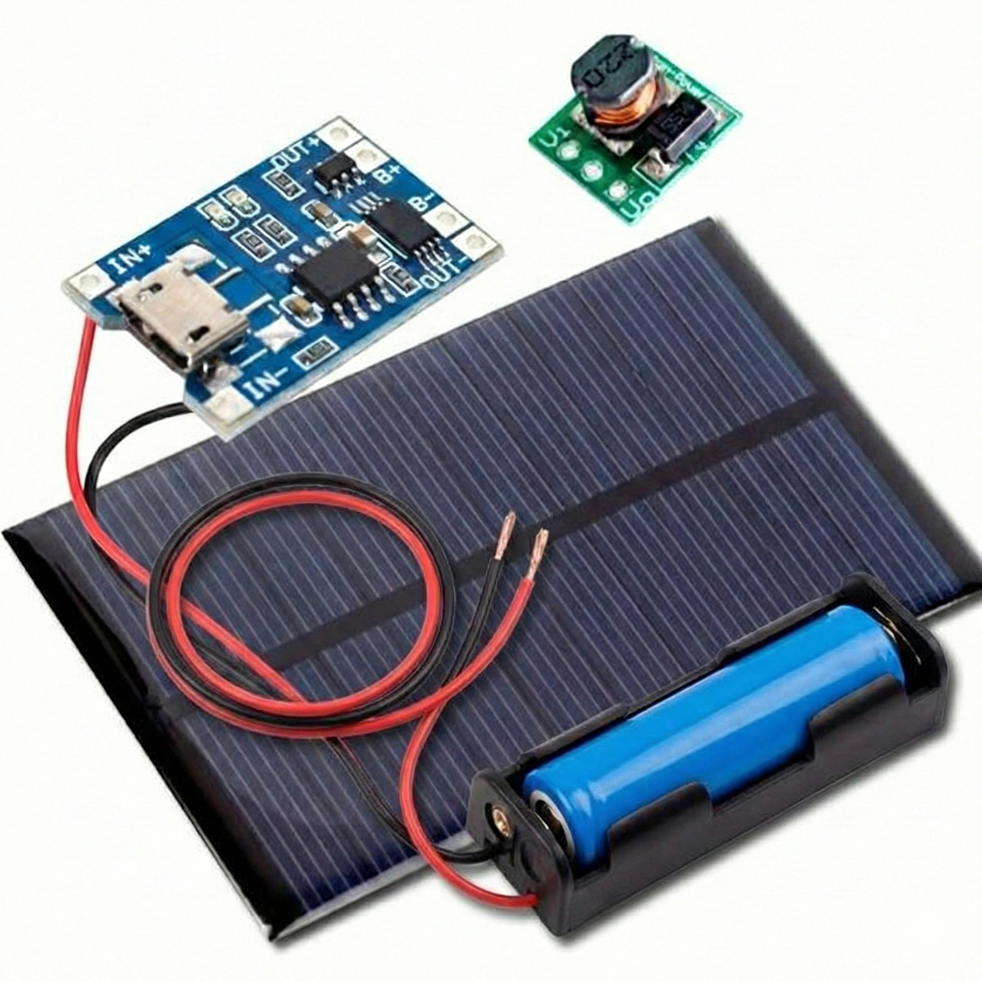 Con este kit solar puedes construir una unidad de alimentación para tu Arduino de 5V. Se compone de un panel solar, una batería de ión de litio de 4800mAh, una base para la bateria, un cargador de batería y un elevador de tensión con salida de 5V. Incluye un conector microUSB que puedes usar para cargar la batería en vez de usar el panel solar.