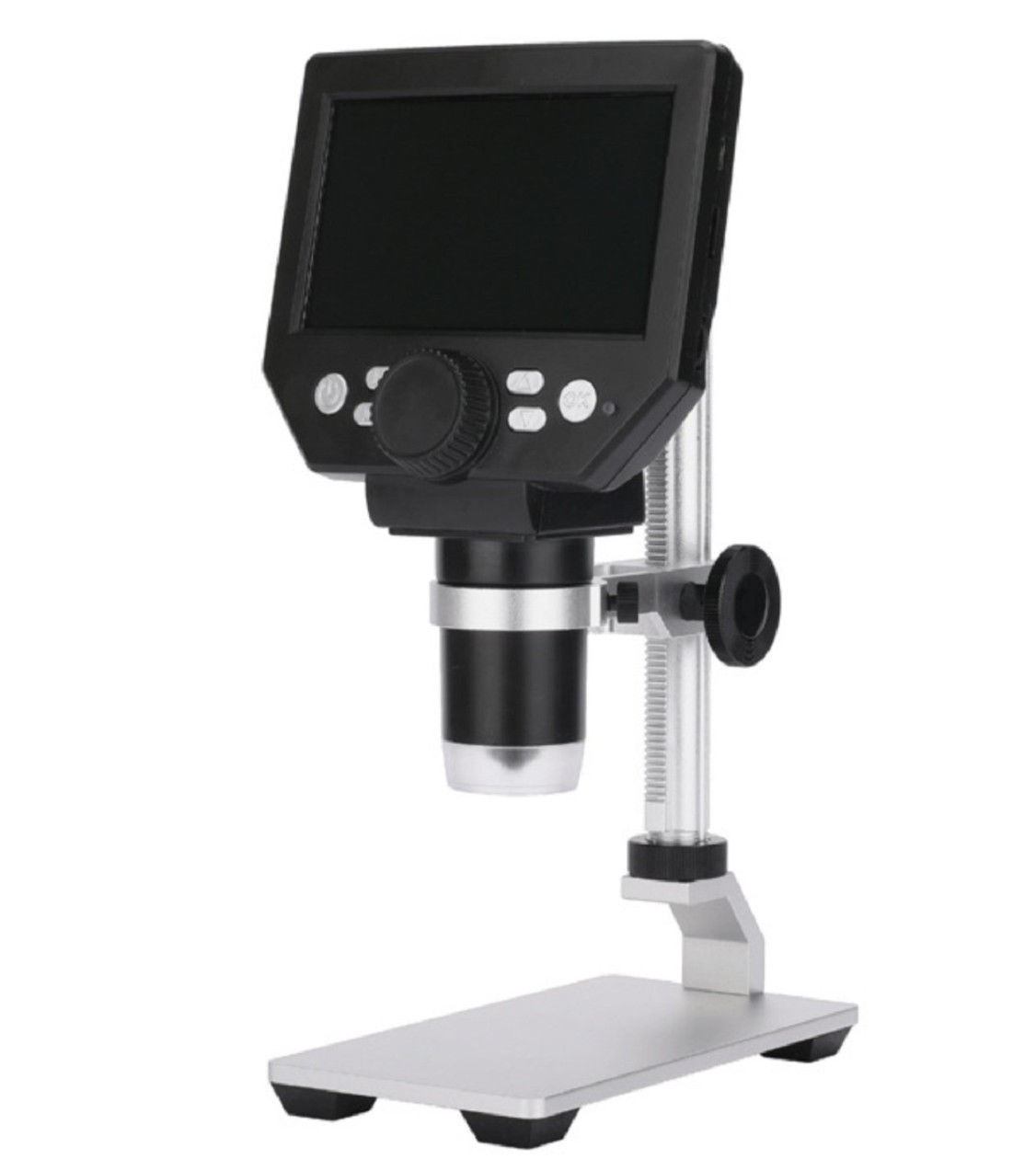 Microscopio digital de 1000 aumentos con pantalla de 1080 x 720 pixels y base de metal.